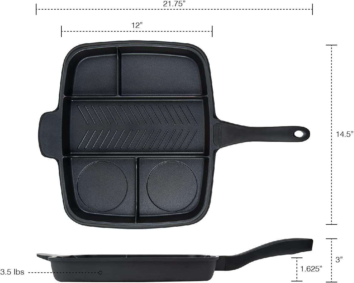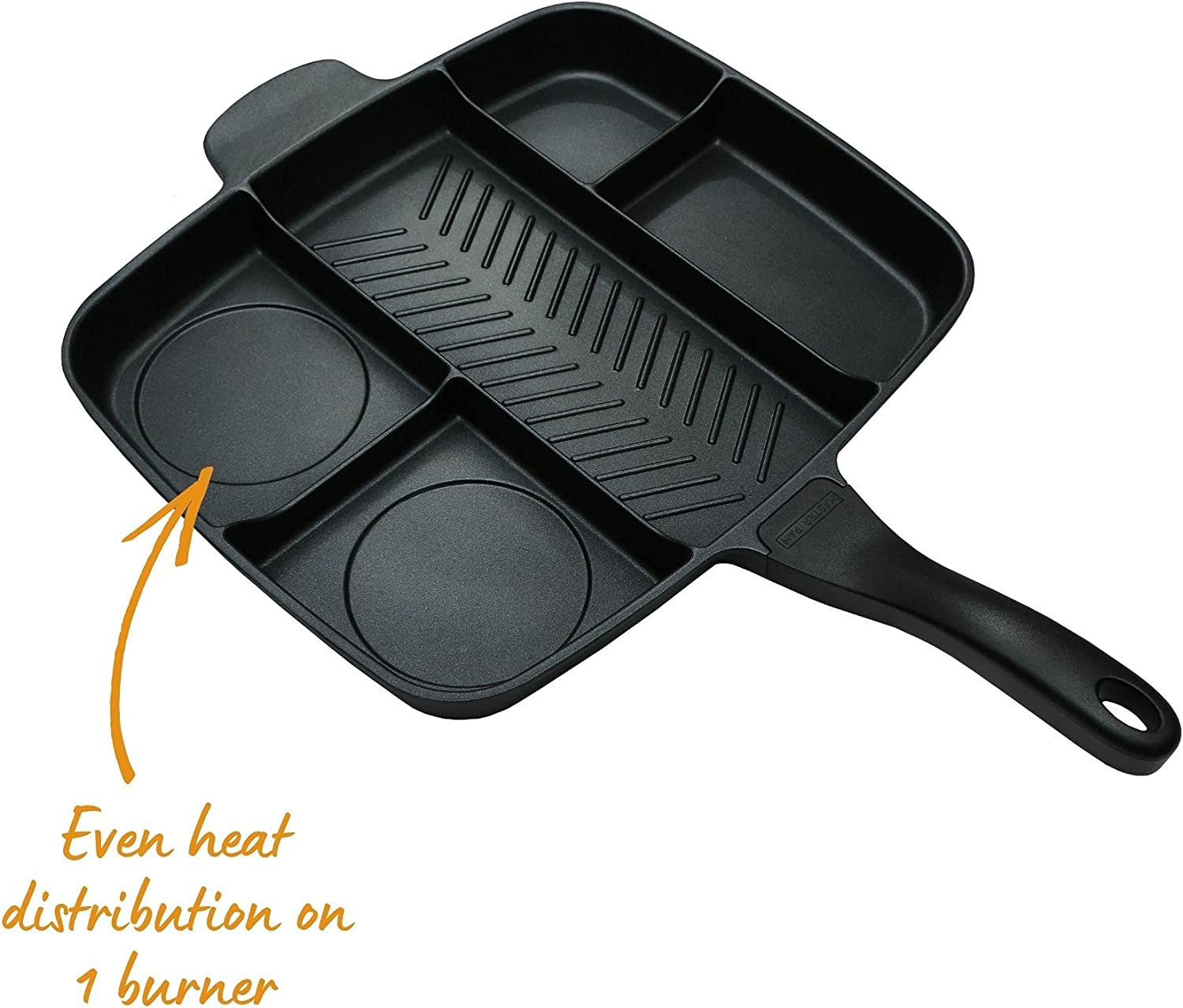 Even though the MasterPan is quite large in size, it only requires 1 burner due to its heavy gauge metallic base plate that distributes heat evenly throughout the pan