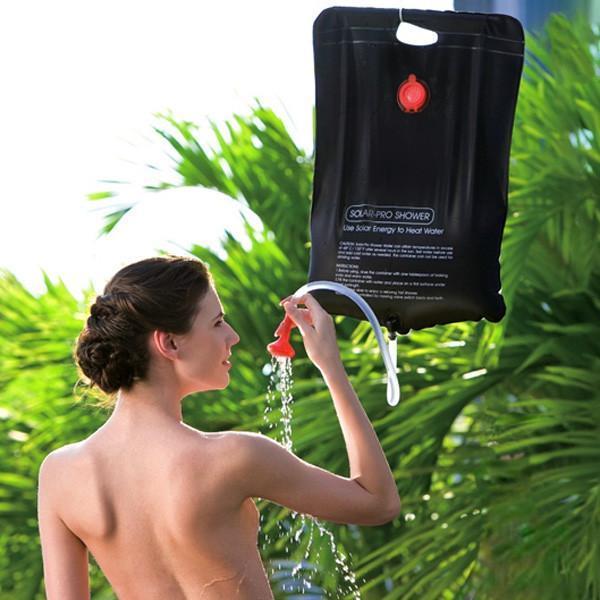 - Portable Outdoor Solar Shower Kit holds 5 gallons / 20 litres for multiple showers and equipped with solar energy heating.