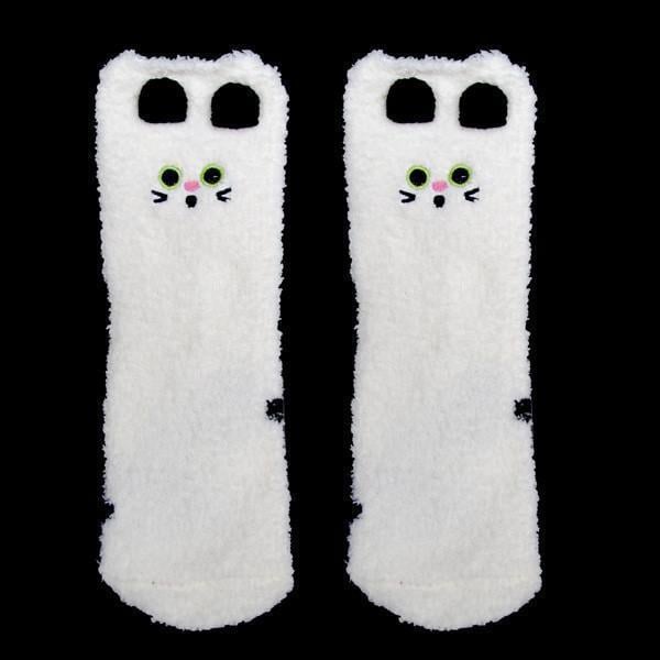 - Soft Kitty Indoor Socks with 3D ear flaps with spotted sock bottoms will keep your feet warm in the long winter nights.