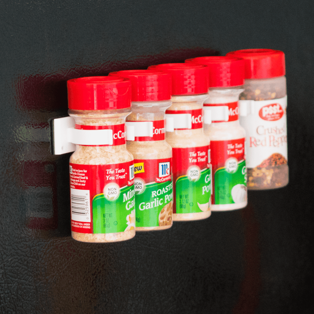 The Spice Clips are perfect for organizing your cabinet or pantry, allowing you to hang your spices up in a clean and space-saving fashion.? They stick anywhere and will save you tons of space while making your kitchen look organized and neat.? They work on almost any spice jar and will really change the way you store your spices.