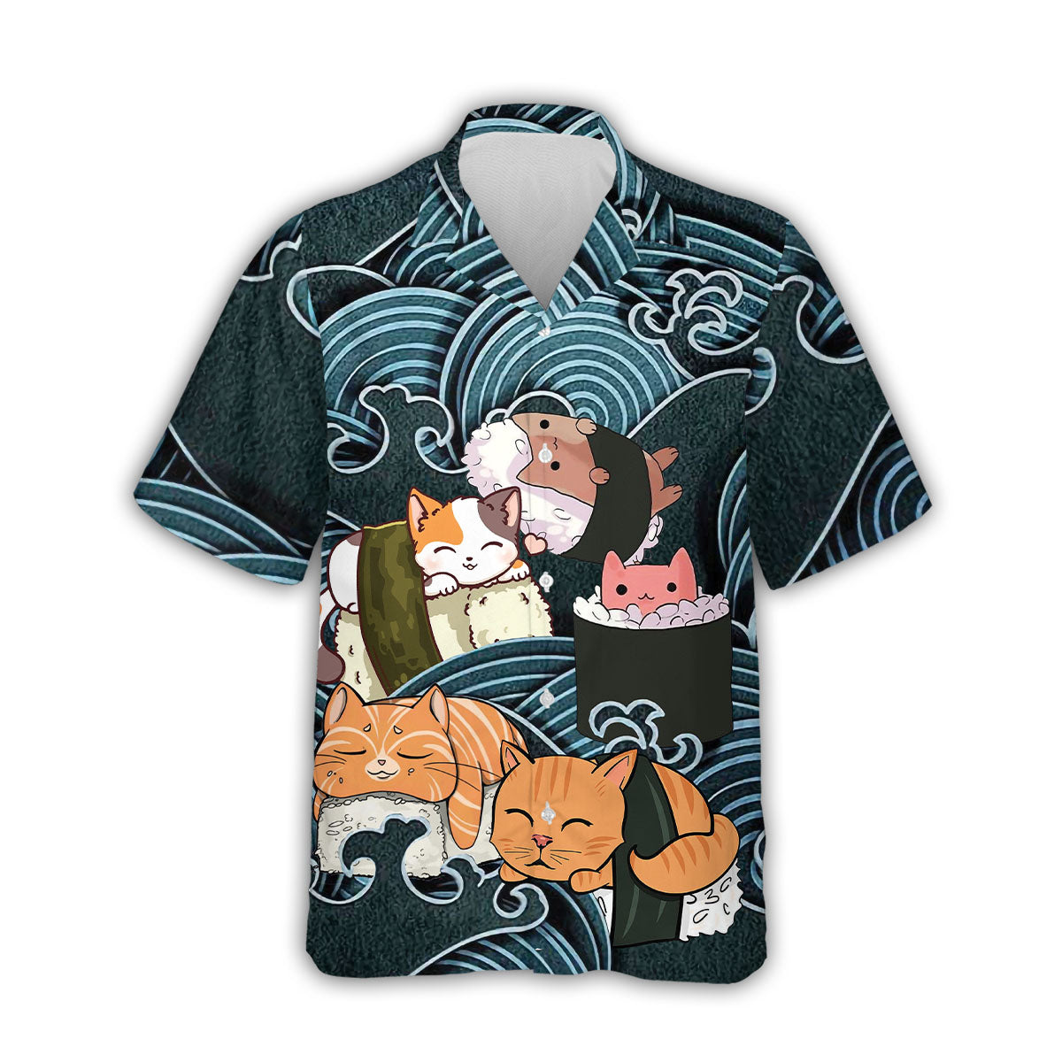 Cute Japanese Cat And Sushi 3D Print Hawaiian Shirt Kitten Lovers Unisex Aloha Button Down Shirt Gifts