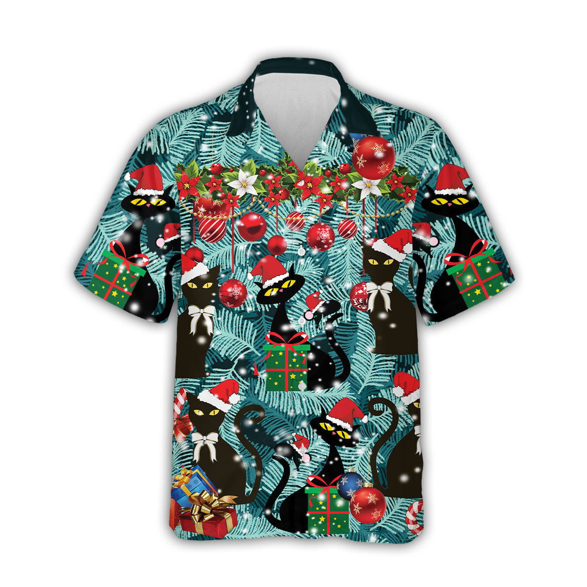 Cute Christmas Black Cat Hawaiian Shirt Xmas Party Kitten Santa Hat Unisex Button Down Aloha Beach Shirt Gifts