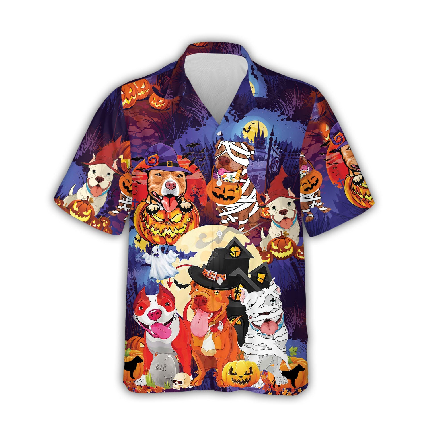 Funny Halloween Witch Pitbull Hawaiian Shirts, Pumpkin Dog Lover 3D Printed Shirt Gift