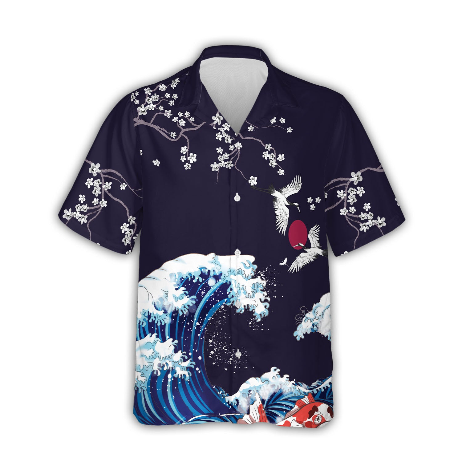 Japanese Style Koi Fish Hawaiian Shirt, Wave Crane Fish Lover Button Down Shirt