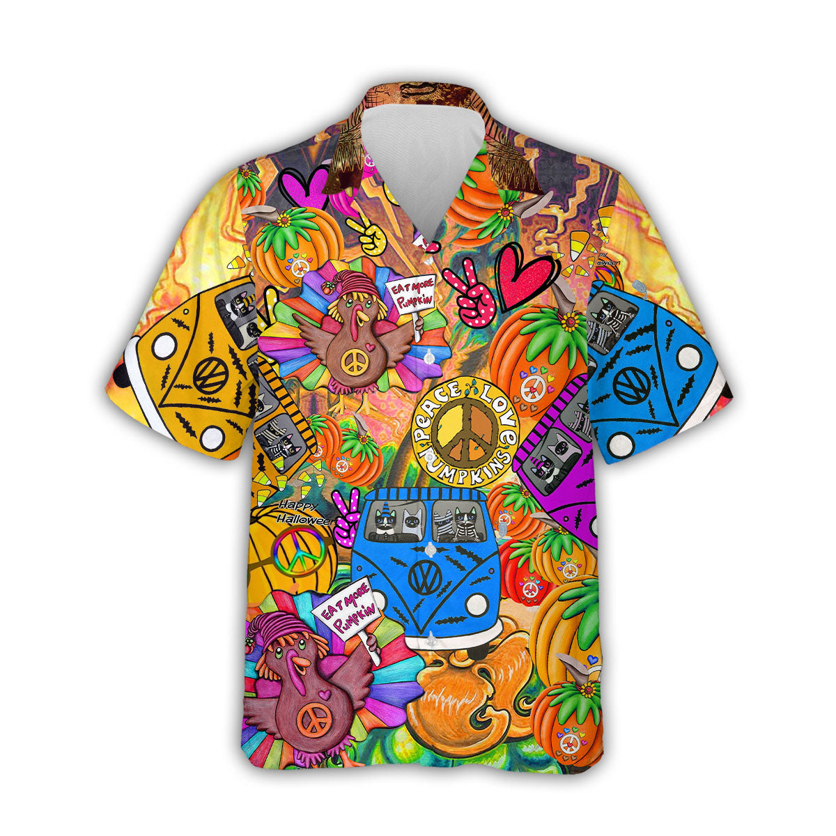 Colorful Hippie Pumpkin Hawaiian Shirts Happy Halloween 3D Print Shirts, Pumpkin Button Down Aloha Beach Shirt Gift